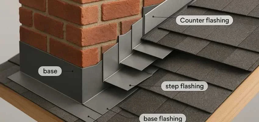 Step flashing tucks under each shingle course along the chimney sides. Counterflashing locks into mortar joints and overlaps those steps. In Rosehill, Caledon the overlap must be precise to block wind-driven rain. We avoid shortcuts like exposed face-nailing that can loosen and leak later.